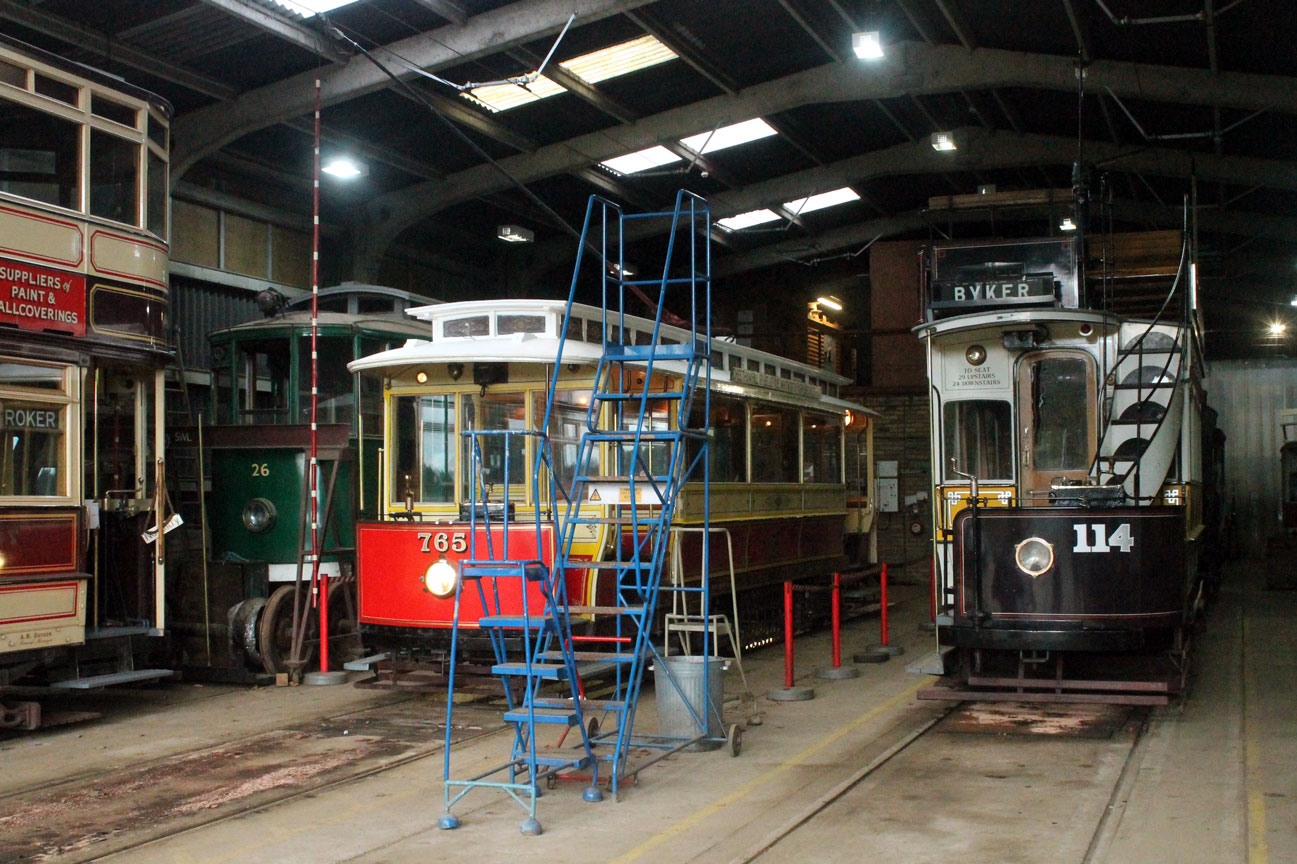 A more general view in the tram depot with 765 in the centre. Newcastle 114 is to the right with Sunderland 16 and 26 the other side.