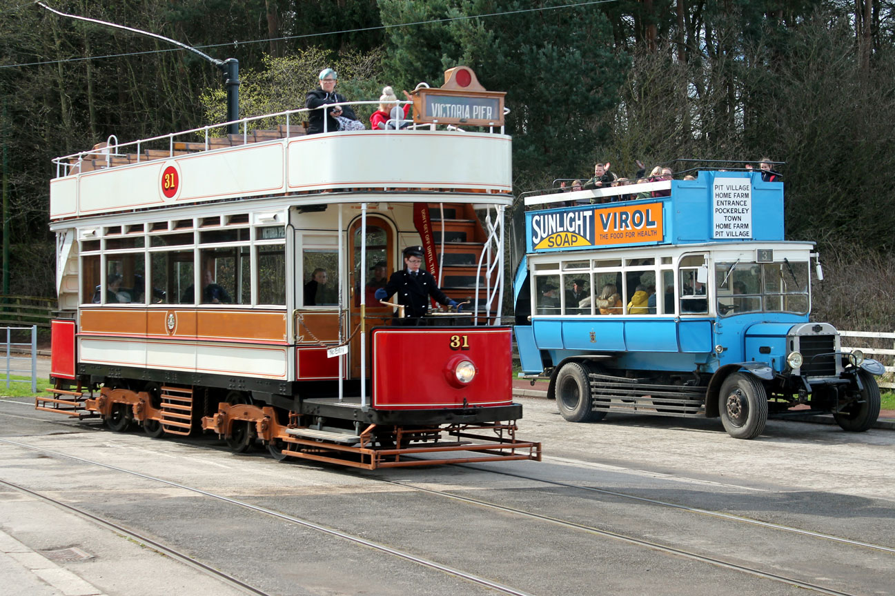 Blackpool 31 and the replica “B” type bus seen together at Pockerley with both heading towards the town.