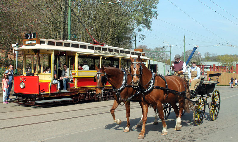A horse and cart trots past Manchester 765 at Foulbridge with the Manchester tram running on the clockwise circuit. Horses will take centre stage at Beamish on 28th and 29th April for the Horses at Work event. In the background the structure of the new bus depot is starting to take shape.