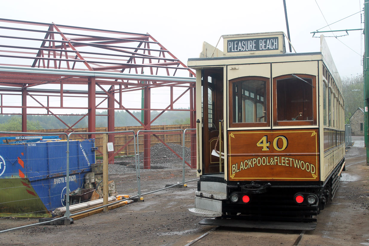 Rapid progress is now being made on the new structure of the new bus depot – a building which will help to alleviate some of the pressure on the tram depot which is becoming more and more crowded – as can be seen in this view. Blackpool & Fleetwood 40 sits outside the depots.