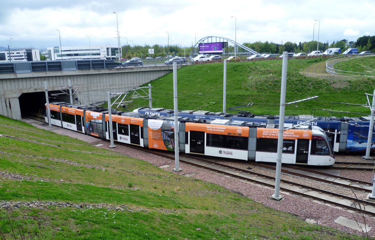 The full effect of the Education Trust advert is seen here on 272 as its about to enter the underpass under the A8 between Edinburgh Gateway and Gyle Centre. Also captured here is 263 which has come through the underpass and is going round the curve to Edinburgh Gateway. Gogar Roundabout is seen above the tramway which gives access to the city bypass, Gyle Centre and South Gyle, Edinburgh Business Park, city centre, tram depot and Edinburgh Gateway station.