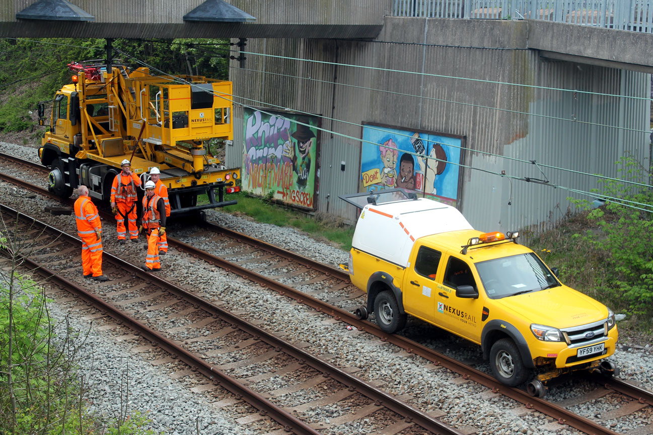The Nexus repair scenes on site to repair the damage with a couple of road-rail vehicles to assist. (Both Photographs by Trevor Hall, 1st May 2019)
