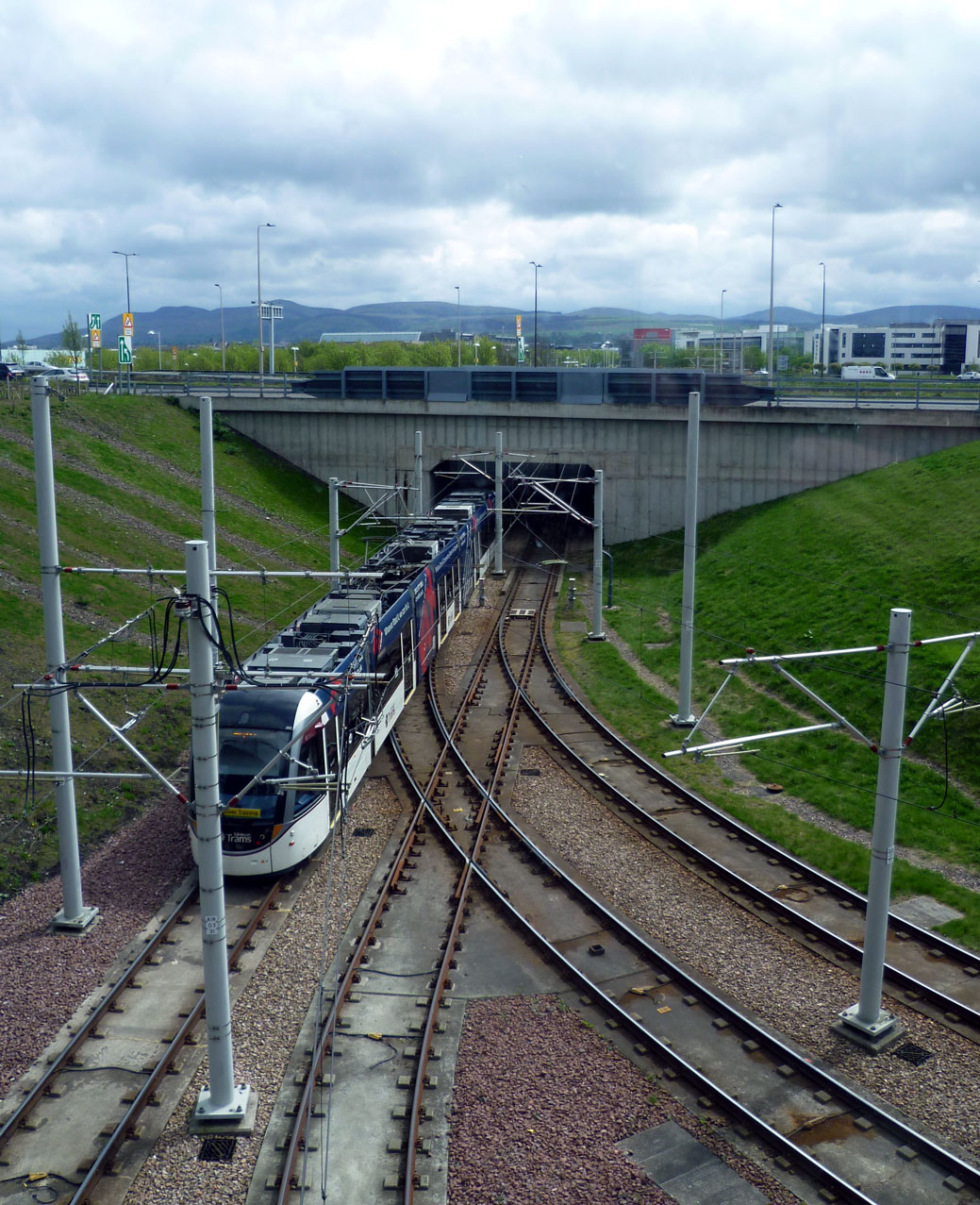 265 joins the main line of the tramway from the depot and entering the underpass under the A8. The next stop it will pass will be Gyle Centre. This view also shows the track layout at this location with the two tracks on the right curving away lead to the stop at Edinburgh Gateway whilst the straight tracks head to the depot at Gogar. (Both Photographs by Roy Calderwood, 1st May 2019)