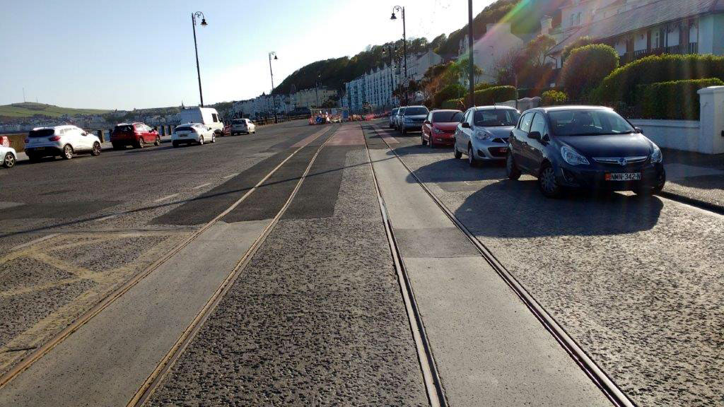 The track immediately leading to the Derby Castle terminus is not being relaid and that is what we see in the foreground of this shot. The red section ahead shows where new track is in place and in this view you can see the wider spacing between the tracks.