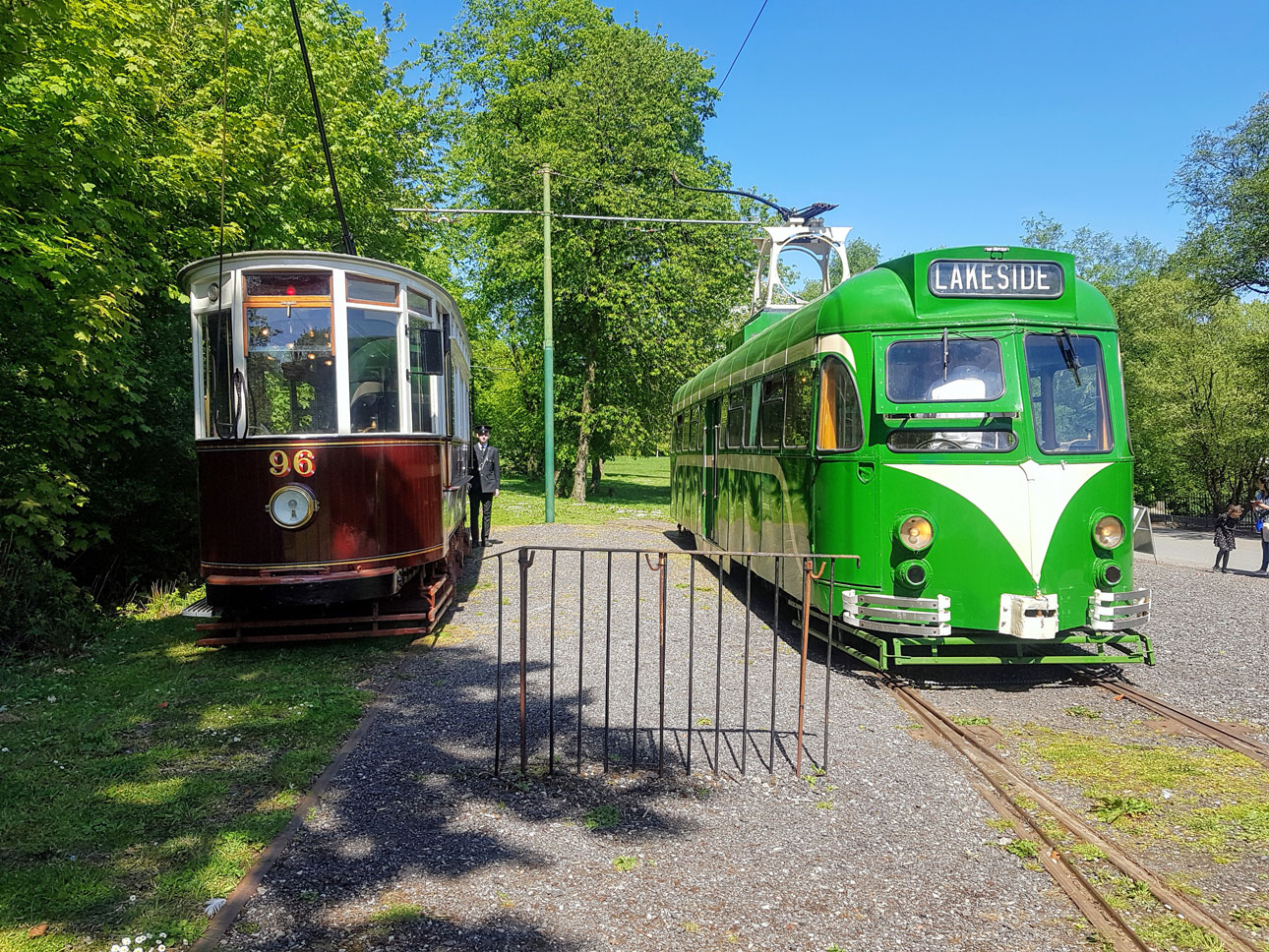 The two trams currently available for service at Heaton Park are seen side-by-side at Lakeside here with Hull 96 and Blackpool 623. (Photographs x4 by David Maxwell)