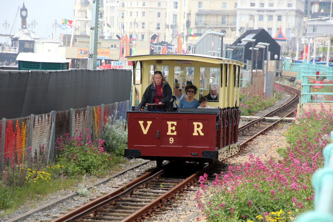 With the Visitor Centre and the station at the Aquarium/Palace Pier in the background 9 heads off with a service to Black Rock.