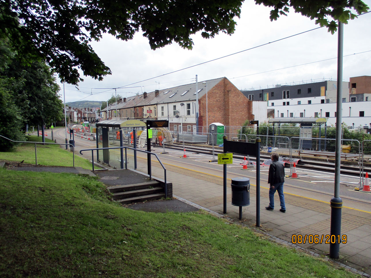 This is the scene at Bamforth Street stop itself with the inbound trackbed fenced off allowing the workers access to replace the track.