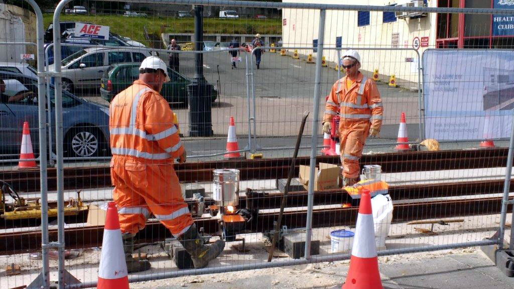 Work on the track has reached the Palace Hotel on Central Promenade as seen in this image. Thermit welding is ongoing in this view.