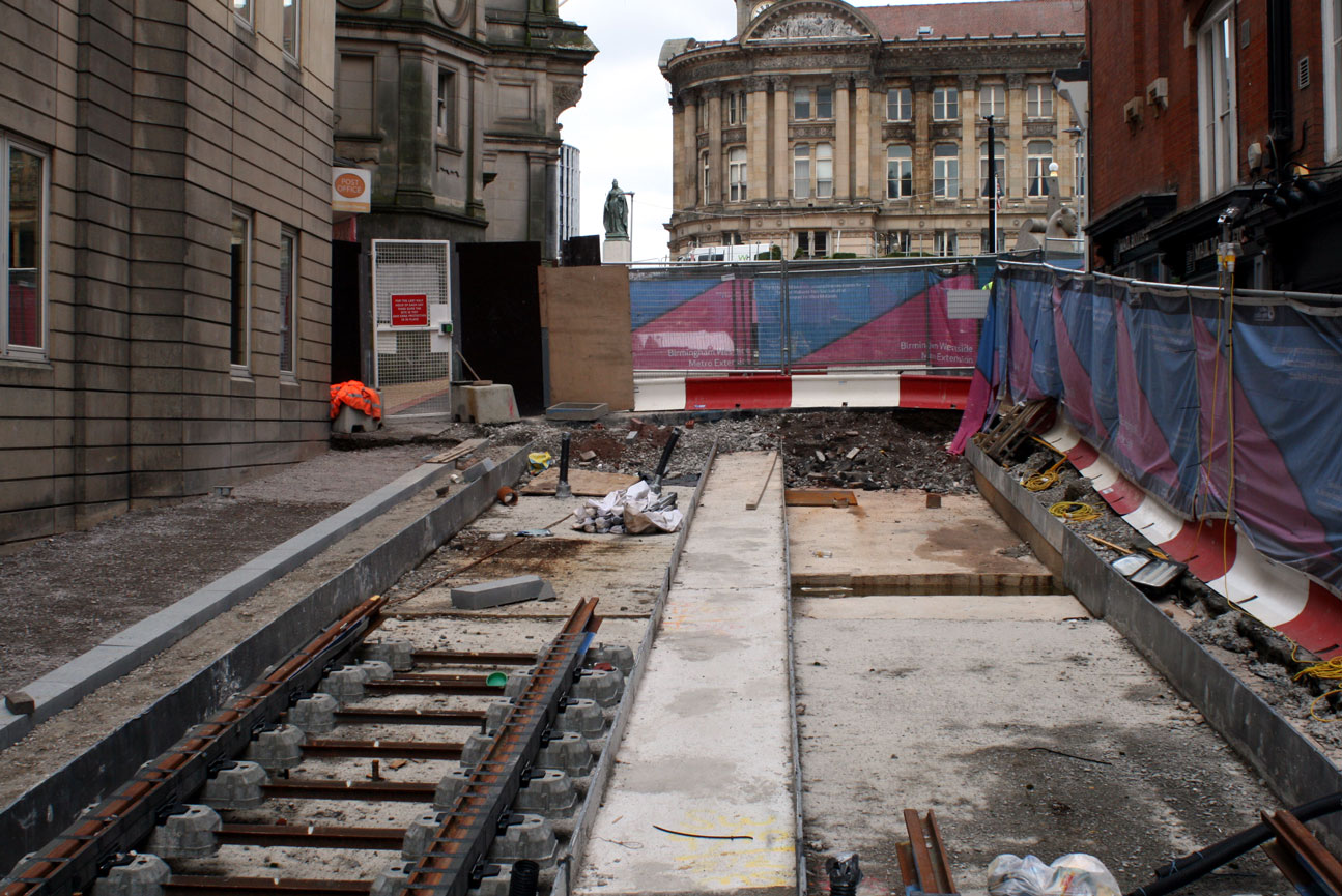 Further along Pinfold Street and the tracklaying comes to an end for now.