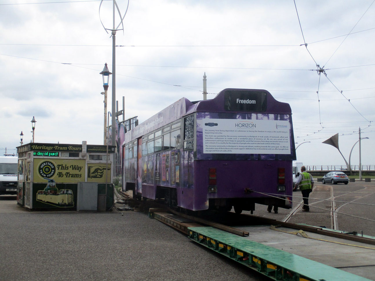 641 is winched aboard the low loader bringing an end to its four year stay at Pleasure Beach.