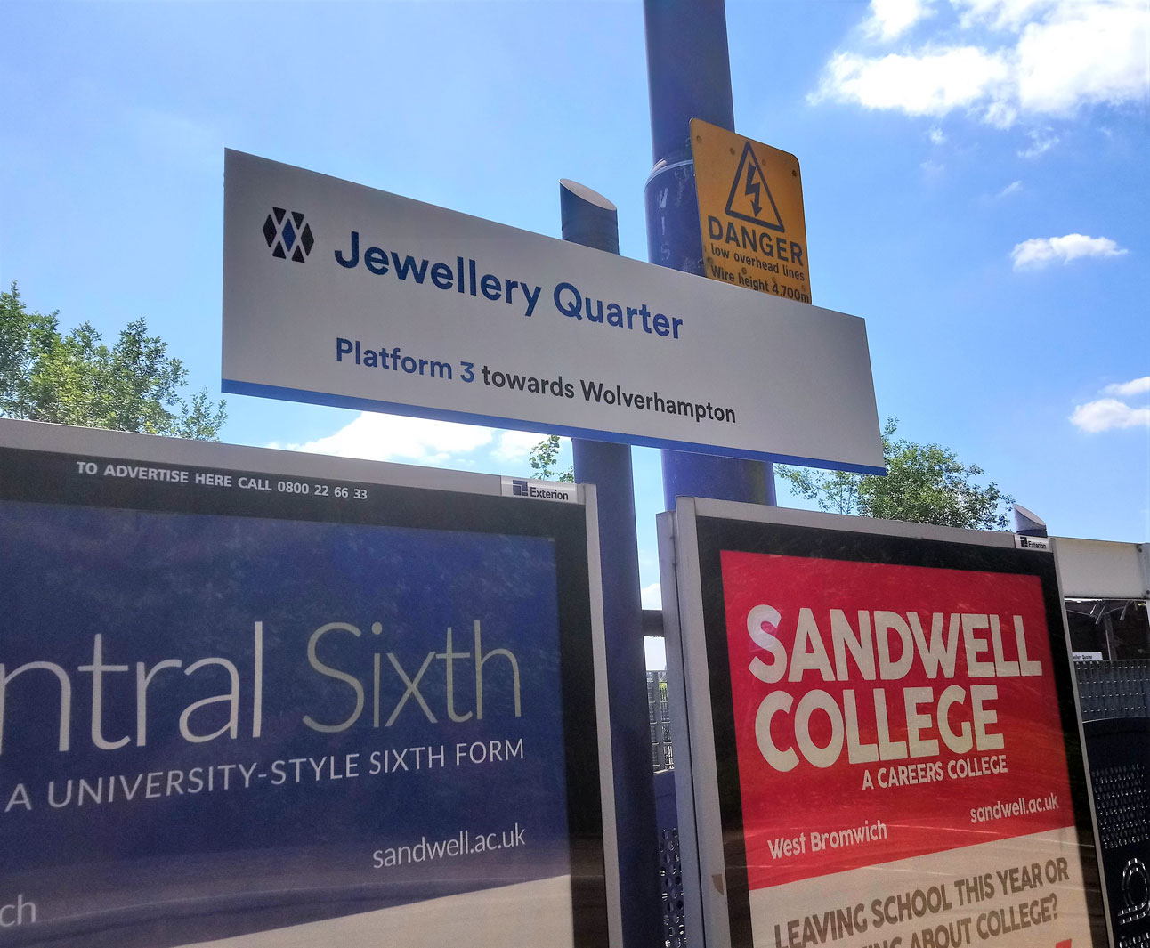The new brand is seen here on the tramstop sign at Jewellery Quarter.