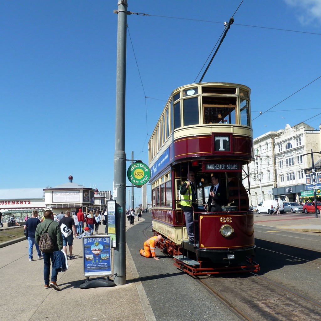Bolton 66 pauses in the loop at North Pier/Tower with a fitter taking a look at its hot axlebox. With a fix not possible on site 66 returned to Rigby Road Depot under its own power and is seen here with its destination blind amended to Manchester Square. (Photograph by Peter Dockerty)