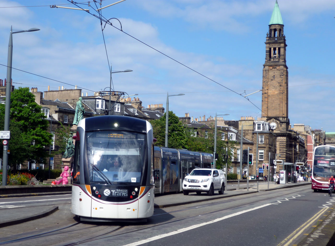 277 has just departed from West End-Princes Street as it starts its journey back to the Airport in this shot. It is using the crossover which is situated on the Haymarket side of this stop. In the central reservation an Edinburgh Trams van is to be found whilst this scene also contains plenty else of interest. The church in the background is the former St George’s West, now the Charlotte Chapel with a statue of former Prime Minister William Gladstone just standing above the tram. The pink figure is of Scottish cartoon character “Oor Wullie” and is part of a trail of these figures across Edinburgh, Glasgow and Aberdeen and raising money for children’s hospitals. A similar trail of Elmer the Elephant is taking place this summer around the Tyne and Wear Metro network.