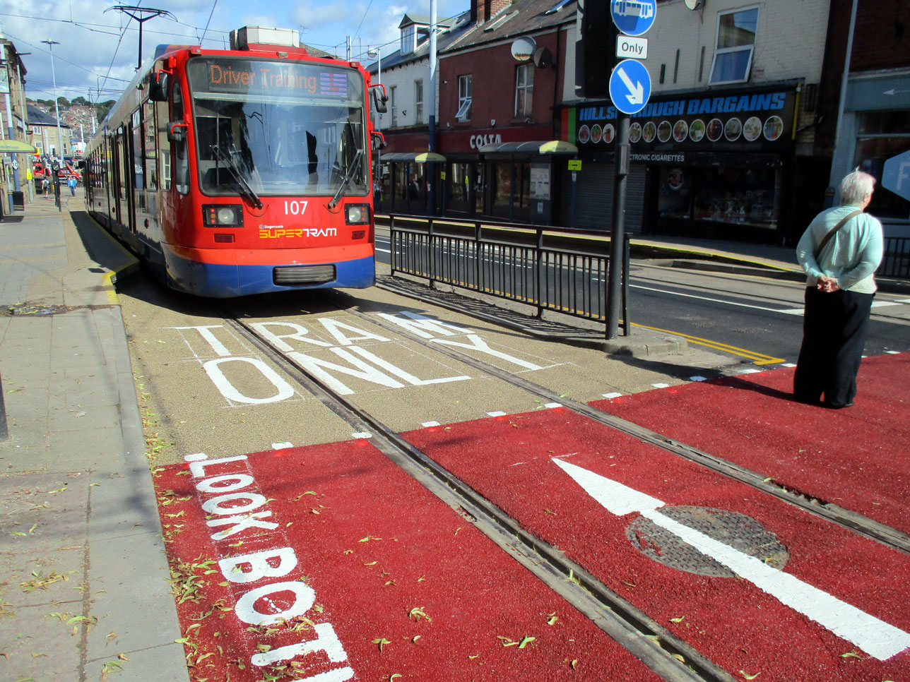 Driver training was also underway on the way to Middlewood and Malin Bridge section with 107 seen here being used for such a purpose. The crossing behind the tram is a notorious scene of many incidents with pedestrians and trams and has now received new bright red surface to try and avoid pedestrians just stepping out in front. (Both Photographs by Stuart Cooke, 18th July 2019)