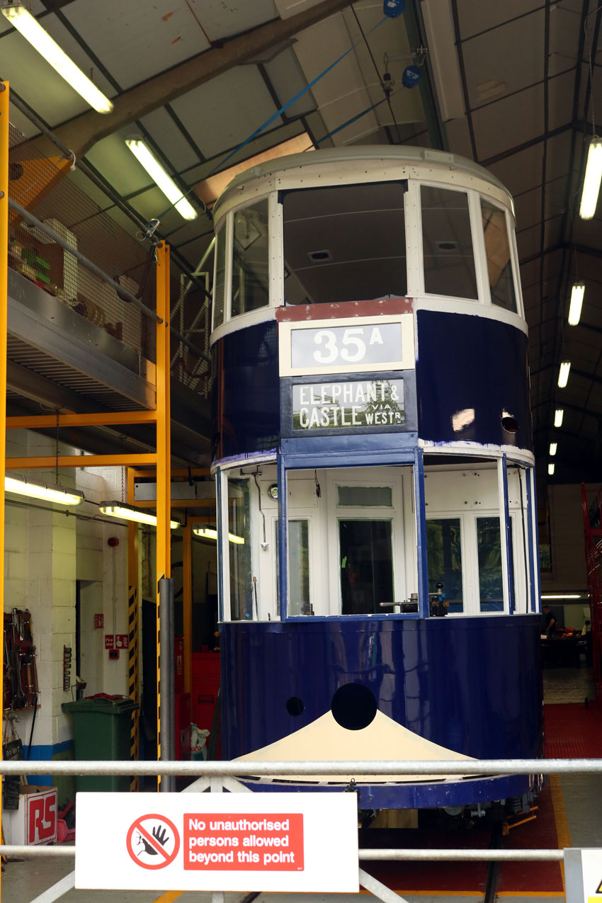 Back in the Workshop and 1 is on road 2 to allow access to the top of the tram. The blue straps seen here are the harnesses required for anyone to safely work on top of the tram.