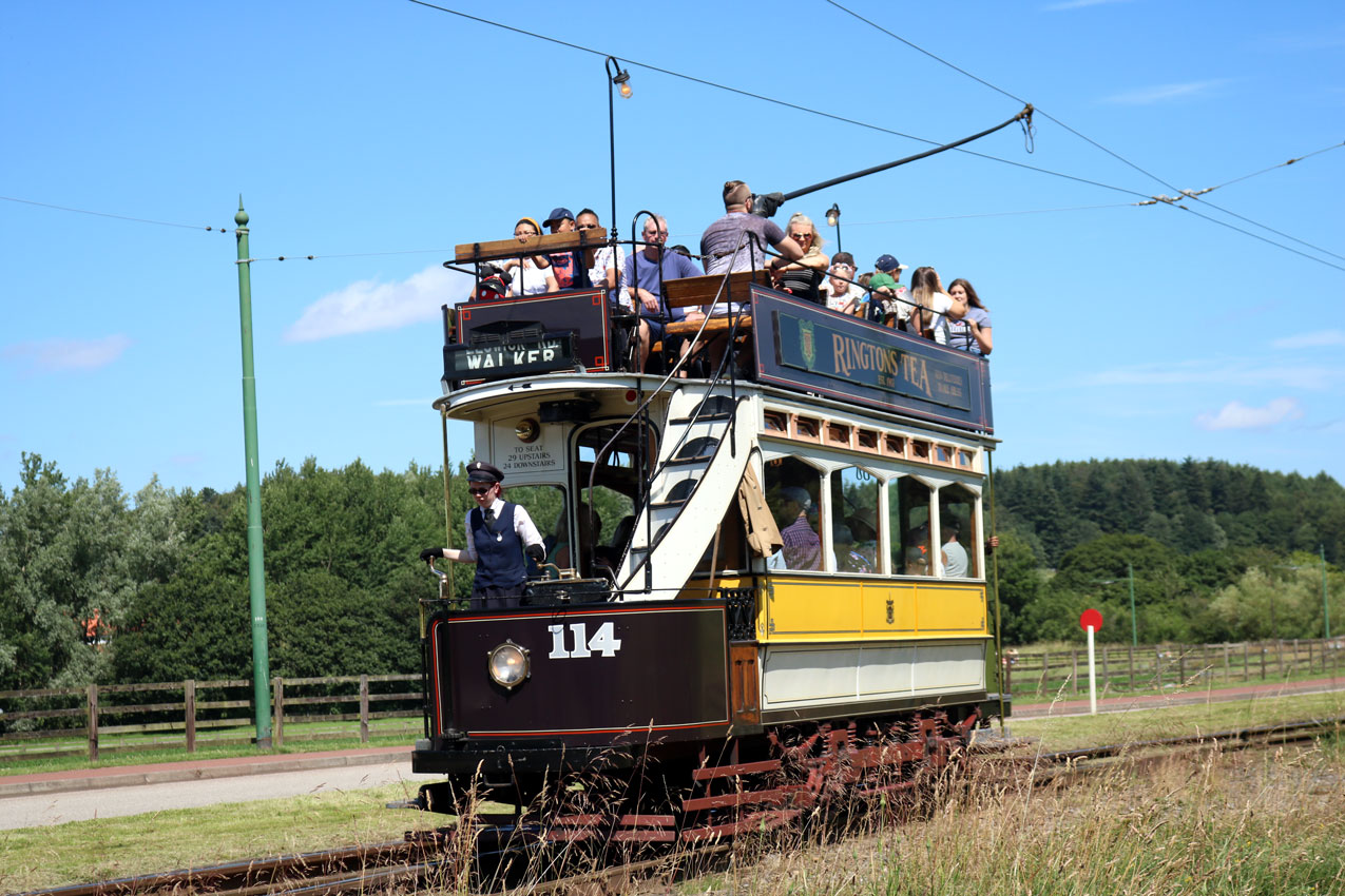 Newcastle 114 approaches Pockerley on a clockwise circuit. Blue skies, warm conditions and an open top tram ride – what more can you ask for?