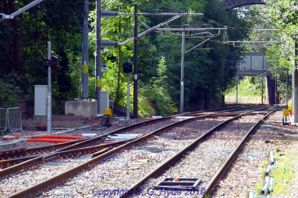 This view taken from the Manchester end pedestrian crossing shows the overhead wiring over the crossover road. Also visible are a couple of new point indictors and a set of the blue SPAS (signal passed at stop) indicator beacons.