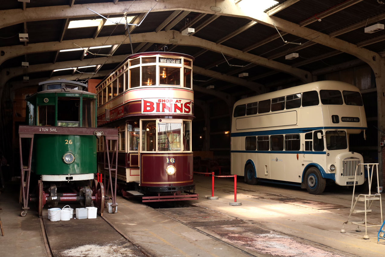 Inside the main depot and it is an unusually empty scene here with Grimsby & Immingham 26 still in mid-air with its wheels seen just in front. Alongside is Sunderland 16 whilst on the far side we see Darlington Daimler 340 VHN, a fairly recent acquisition by the museum. 26 isn’t the only tram currently lifted with Oporto 65 also remaining in mid-air at the rear of road 1.