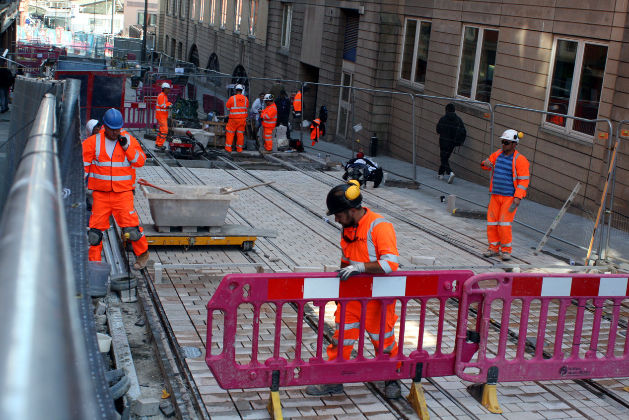 Pinfold Street where there was a gap in the track until recently is seen here with work underway on filling in that gap as well as putting the block paving down.