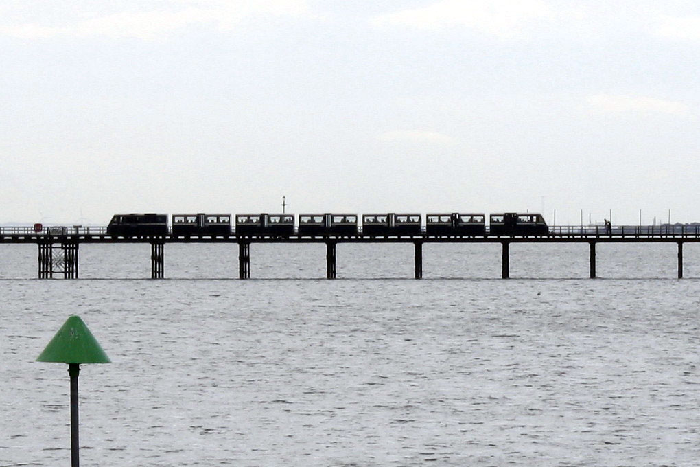 A view from off the Pier looking across the Southend Pier Railway with one of the trains in operation taking weary visitors along the length of the country’s longest Pier. Funding has been secured for upgrade work on the Pier which will include the acquisition of new trains.