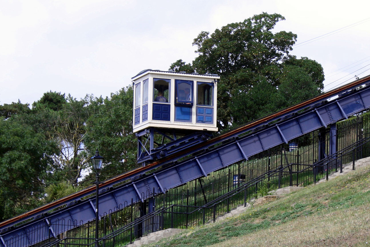The carriage can hold up to 13 people (which includes the operator) and has disabled access with ramps. In this view we see the lift heading down. (All Photographs by Nigel Pennick, 7th August 2019)
