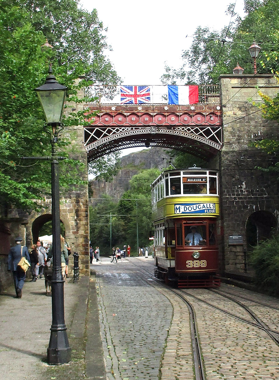 Leeds 399 passes under Bowes Lyon Bridge heading down to Stephenson Place. Note the Union and French flags draped from the bridge.