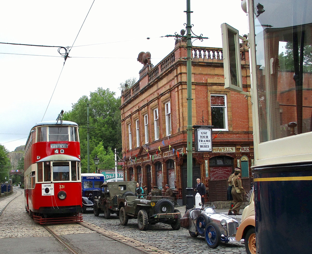 MET 331 sits outside The Red Lion with Leeds 345 also waiting for its next service. Also in this shot we see a number of period vehicles including several military style cars.