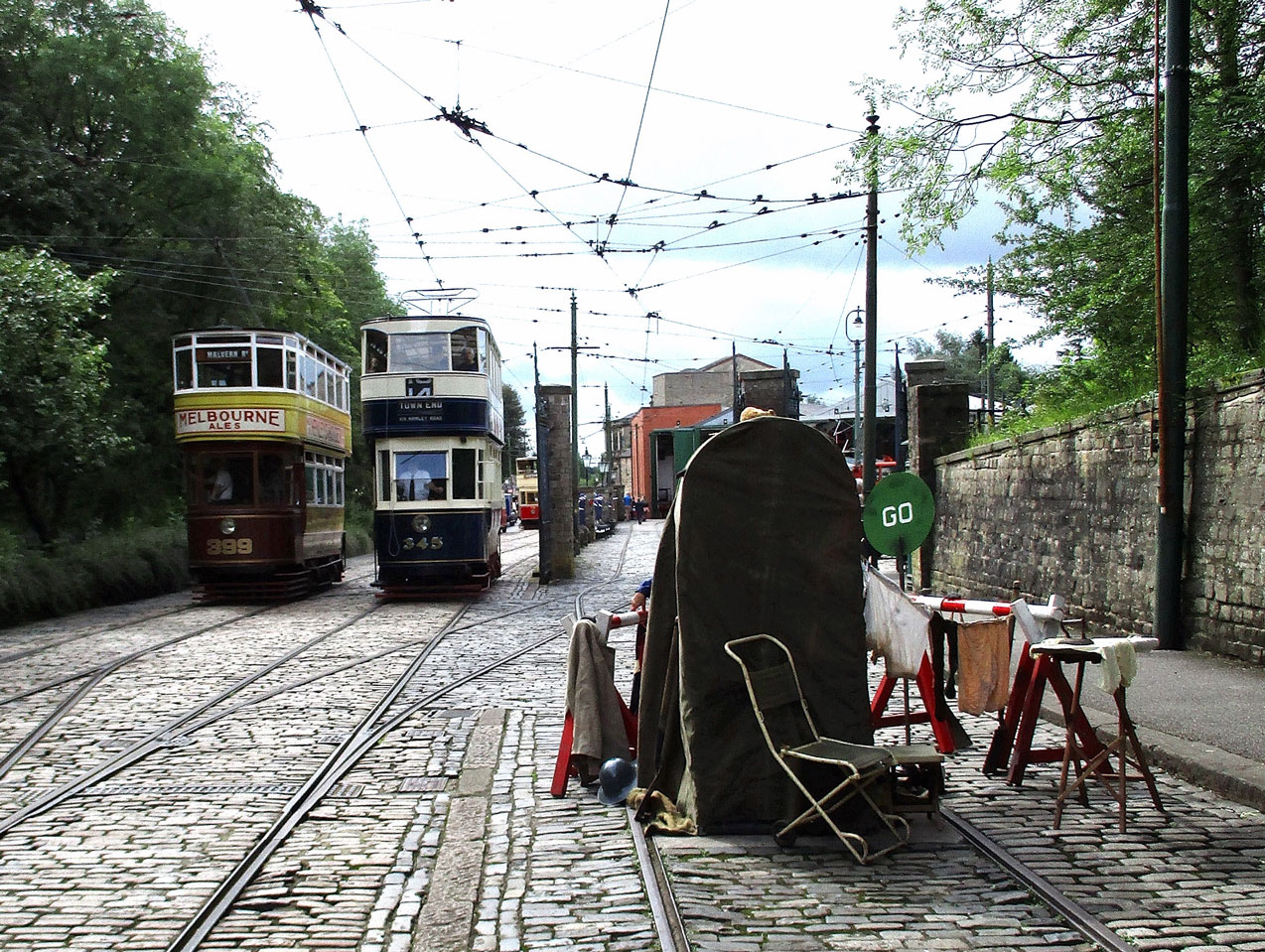 Leeds 399 and 345 pass at the depot entrance (with Blackpool 40 also visible in the background). On the right a roadblock is in place with some work seemingly underway!