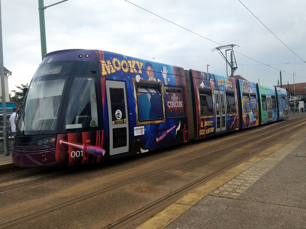 This is the side of the tram which advertises Blackpool Tower Circus and the Sealife Centre with this view at Cleveleys showing the Circus advert.