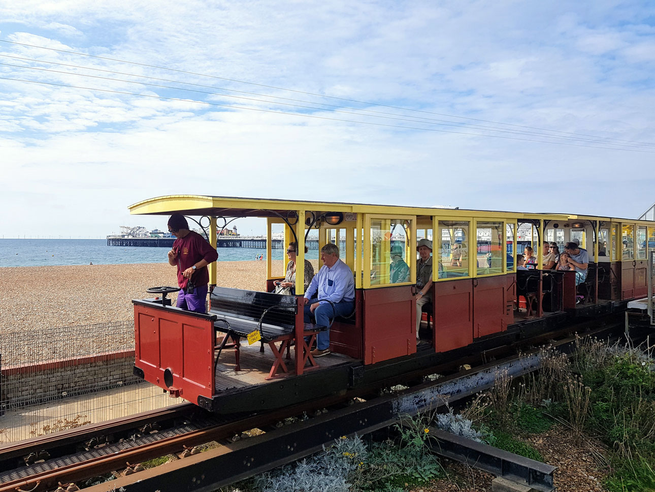 Two cars which have to run as a double – due to their control systems – are 7 and 8, both of which were built in 1901 (the third class member built as this time is 6 which was one of those to be rebuilt at Alan Keef). This view shows 7 leading 8 away from the Palace Pier terminus although no fleet number is currently carried.