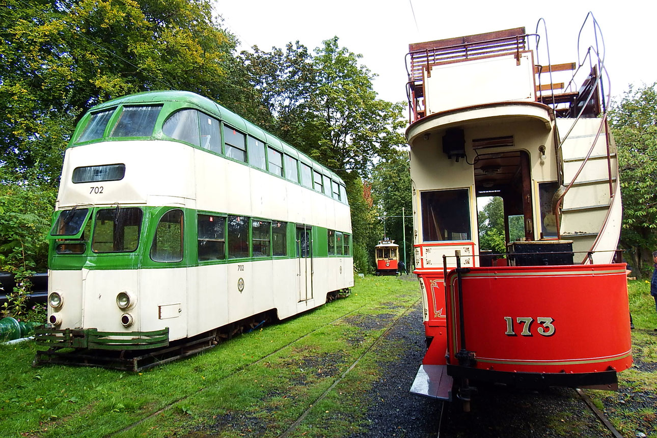 Outside Lakeside Depot and stored cars Blackpool 702 and Manchester 173 were on display. Manchester 765 can also be seen in the background.