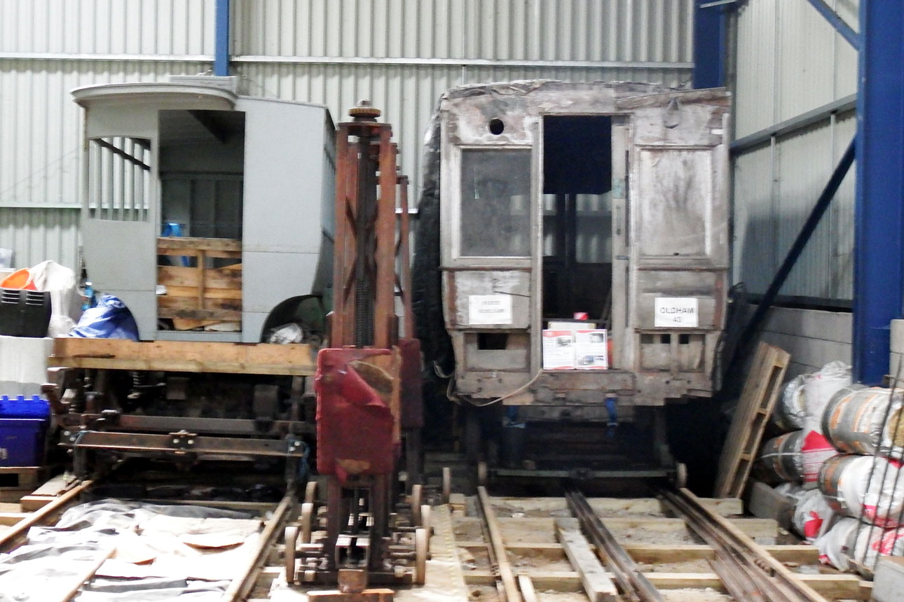 Inside Lakeside Depot and the Manchester Horse Bus (on Rawtenstall 23’s truck) is on the left of this image with the body of Oldham 43 also seen.