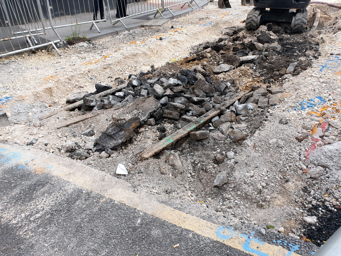 Found again after 59 years! The track in Bridge Street is seen here amongst the rubble of the old road surface. (Photograph by Ryan Hartley, 29th August 2019)