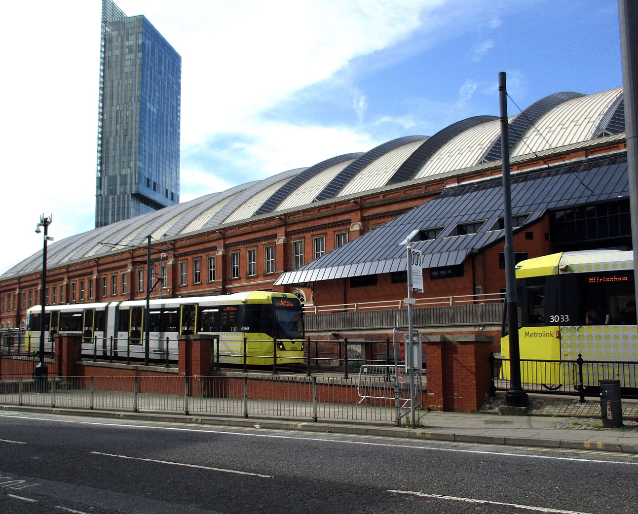 As 3069 comes off the viaduct leading to the stop at Deansgate-Castlefield as it heads off to Ashton-under-Lyne we also see 3033 leading a service for Altrincham about to ascend.
