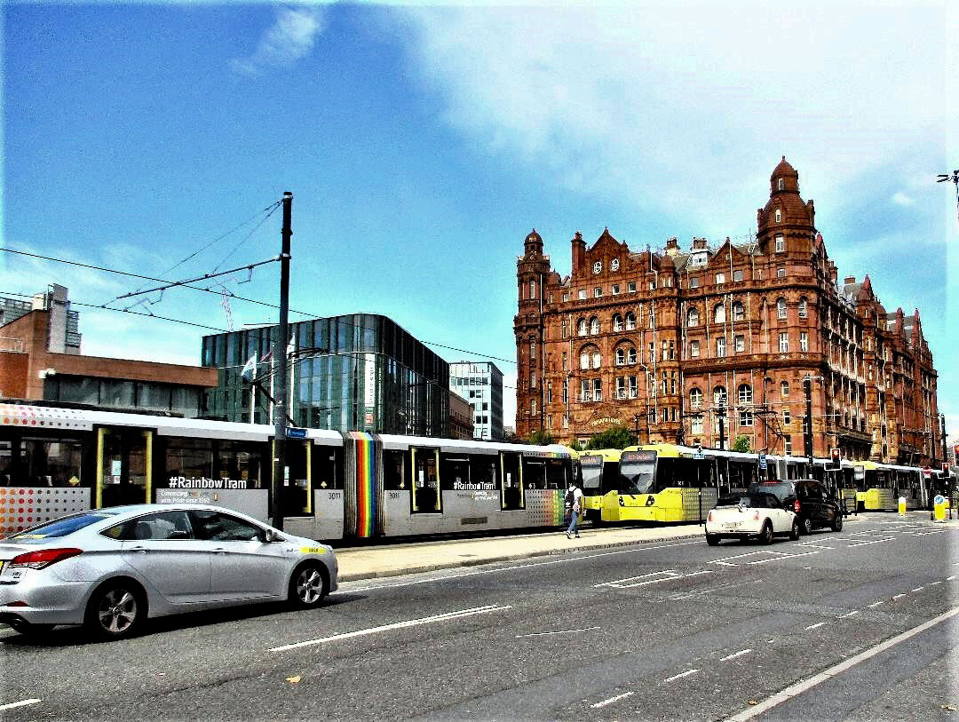 The grand building in the background here is the Midland Hotel, built opposite the entrance to the old railway station and still in use as a high-end hotel. Meanwhile, two double trams pass on Lower Mosley Street which includes 3011 still retaining its vinyls as the Rainbow Tram. (All Photographs by Hazel Quarmby, 14th September 2019)