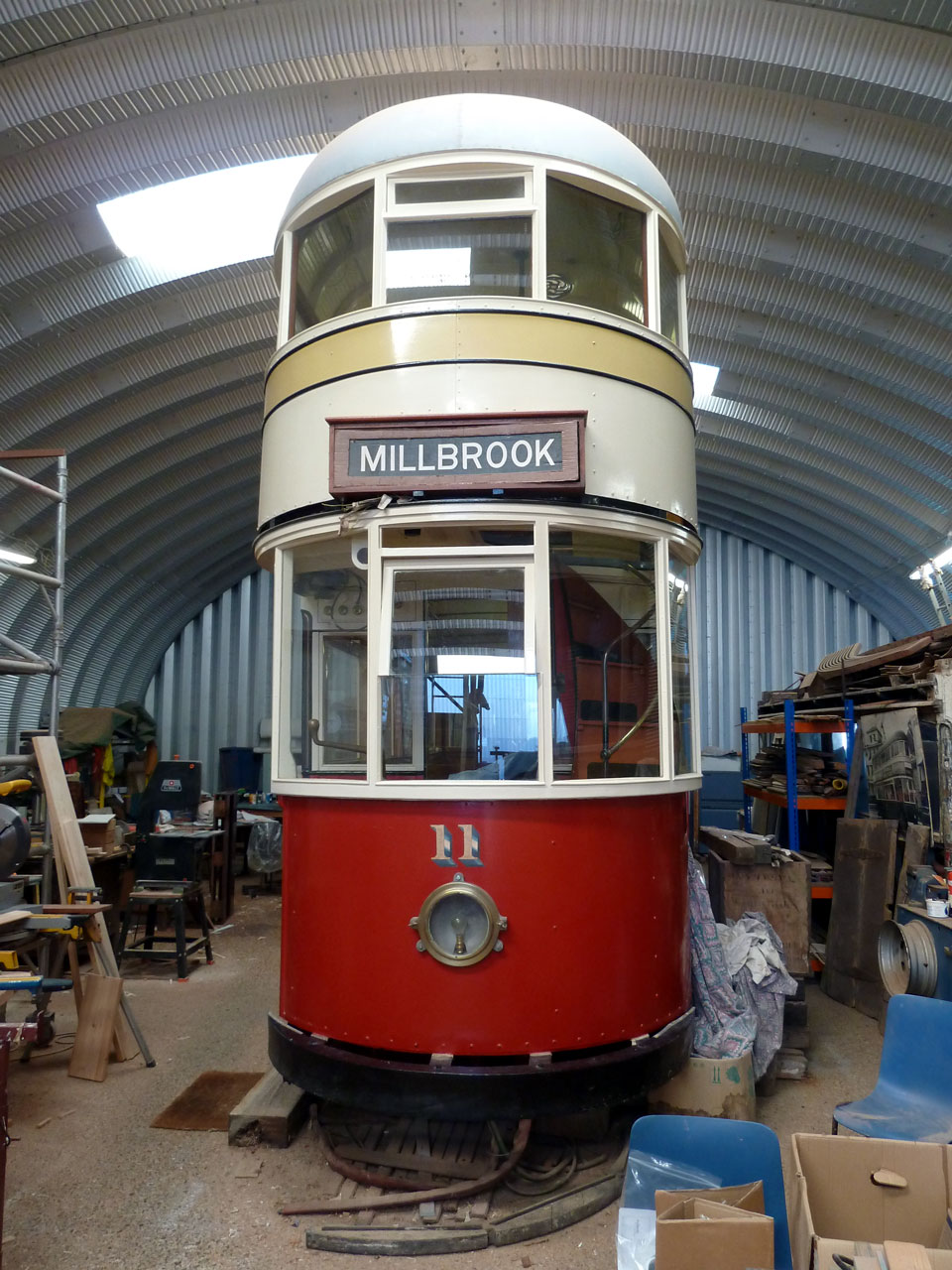 No. 11, the domed roof car which has seen the most work concentrated it is seen here in the workshop in this end view.