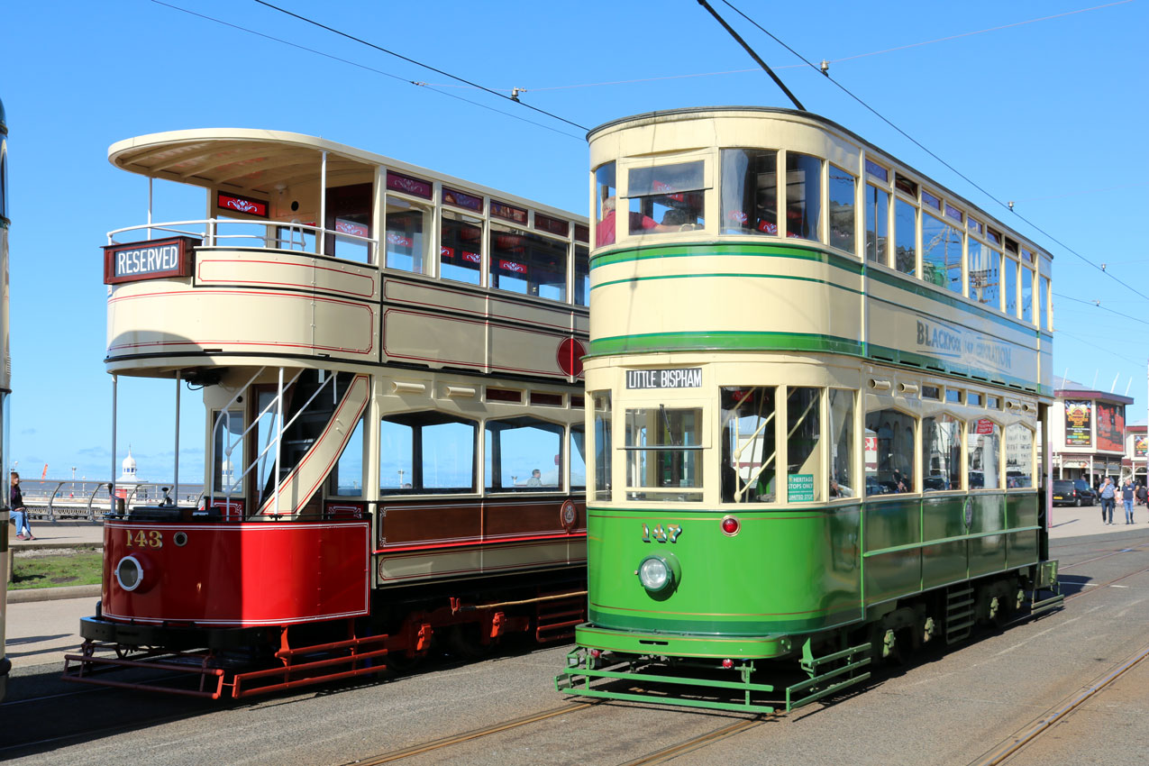 It’s the shot we all wanted – two Standard Cars together again in Blackpool. With 143 in the loop line at North Pier/Tower, 147 passes by heading off to Little Bispham. (Photograph by Trevor Hall)