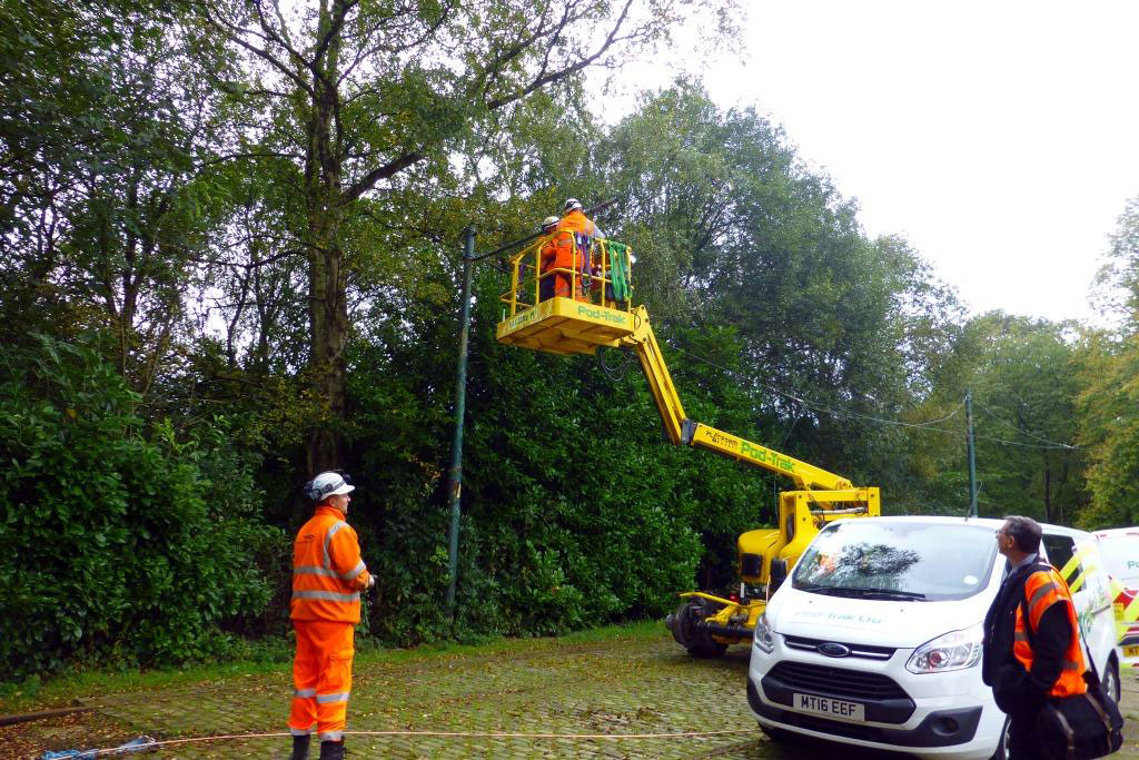 The teams now move over to the site of the cut wires and commence repairs to a damaged bracket arm before running out replacement contact wire.