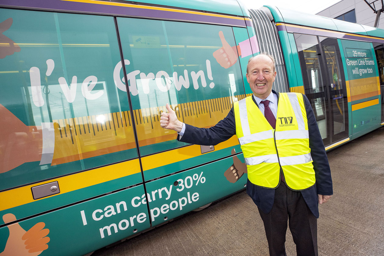 The first of the new longer trams unveiled at the depot with Shane Ross, Minister for Transport, Tourism and Sport giving it the thumbs up.