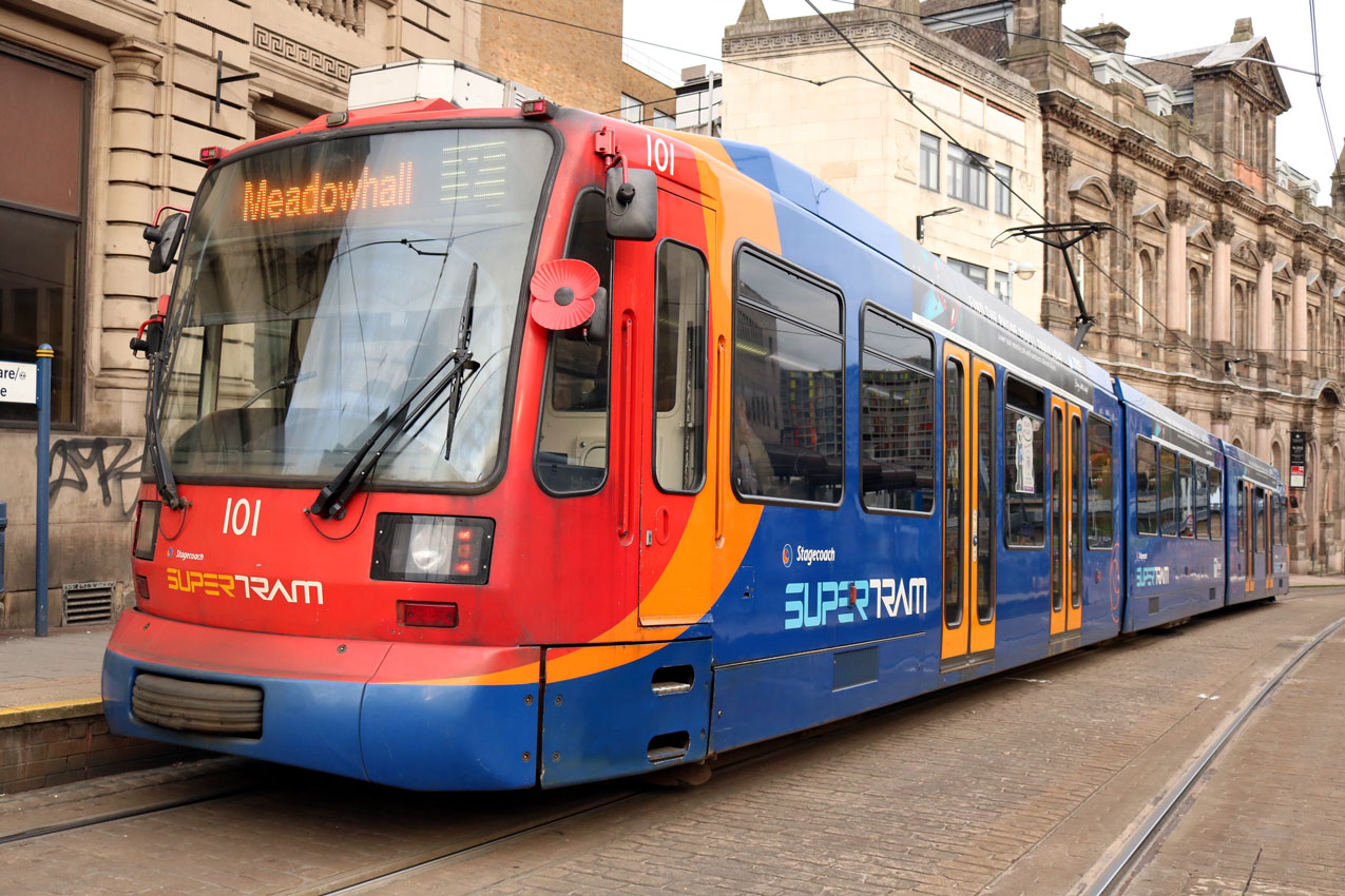 101 shows off its poppy with pride at Fitzalan Square when operating a Yellow route service to Meadowhall. (Photograph by Trevor Hall, 19th October 2019)
