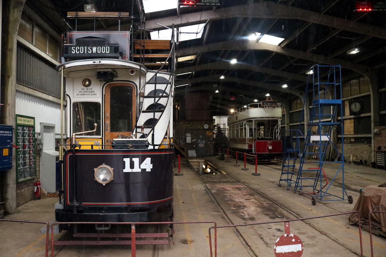 Back in the main tram depot and Newcastle 114 and Blackpool 31 are joined by Steam Elephant seen at the very rear behind 31.