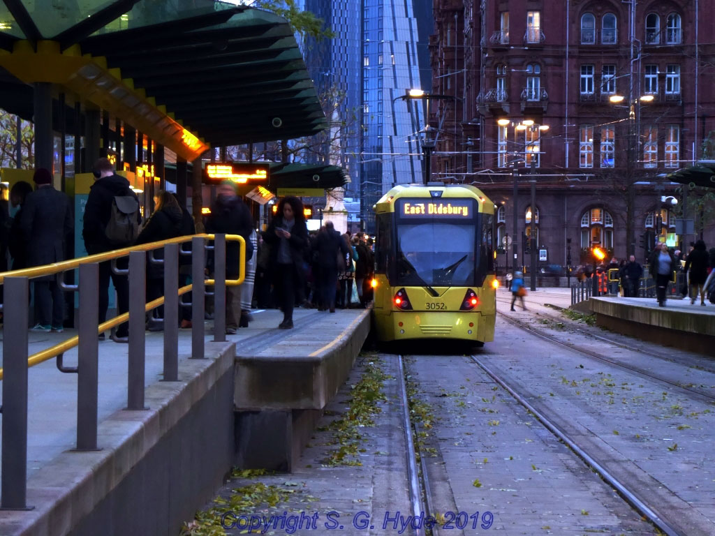 At the St Peters Square 2CC outbound platform 3052 is seen arriving with an East Didsbury service.