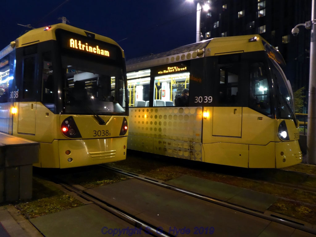 Before leaving Deansgate Castlefield a final photograph showing 3038 at the rear of a coupled set on its way to Altrincham as and 3039 &3037 prepare to depart to Bury via Market Street. (All Photographs by Steve Hyde, 12th November 2019)