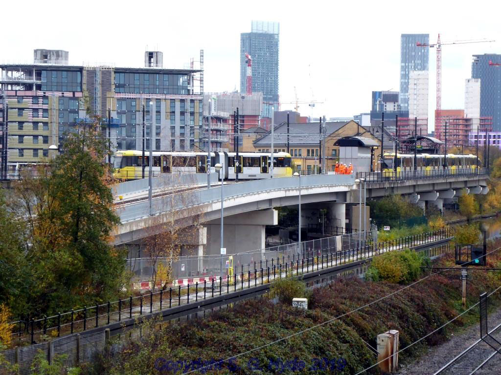 At the start of testing and this view at Pomona stop shows a queue of trams awaiting test movements. This view is taken from the junction of Trafford Road and Bridgewater Way.