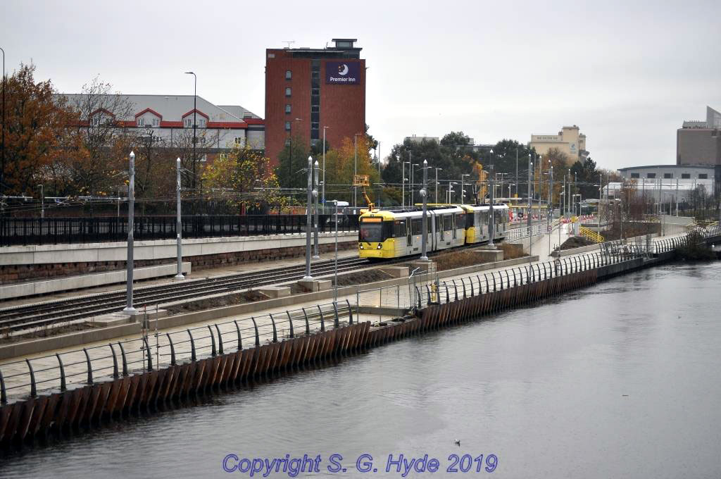 3086+3082 departs from Wharfside alongside the Ship canal with a run back towards Trafford Road and Pomona. (All Photographs by Steve Hyde, 17th November 2019)