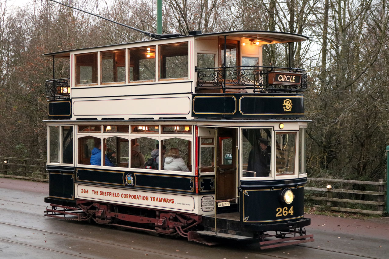 Sheffield 264 is seen in this view, again at the Entrance. This tram was running anti-clockwise. (Both Photographs by Trevor Hall, 5th December 2019)