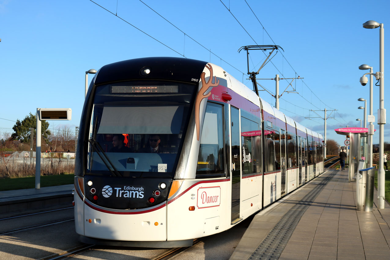 One of the four trams to have received names and antlers is 262. With different names at each end this end shows Dancer with the tram at Saughton. (Photograph by Trevor Hall, 11th December 2019)