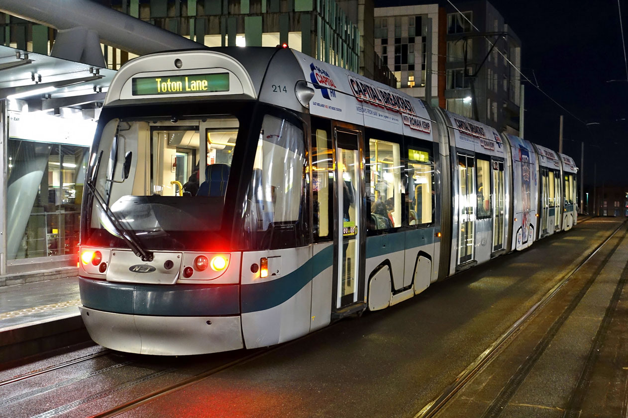 214 – one of the Incentro trams which hadn’t been refurbished – is seen here as it prepares to depart for Toton Lane.