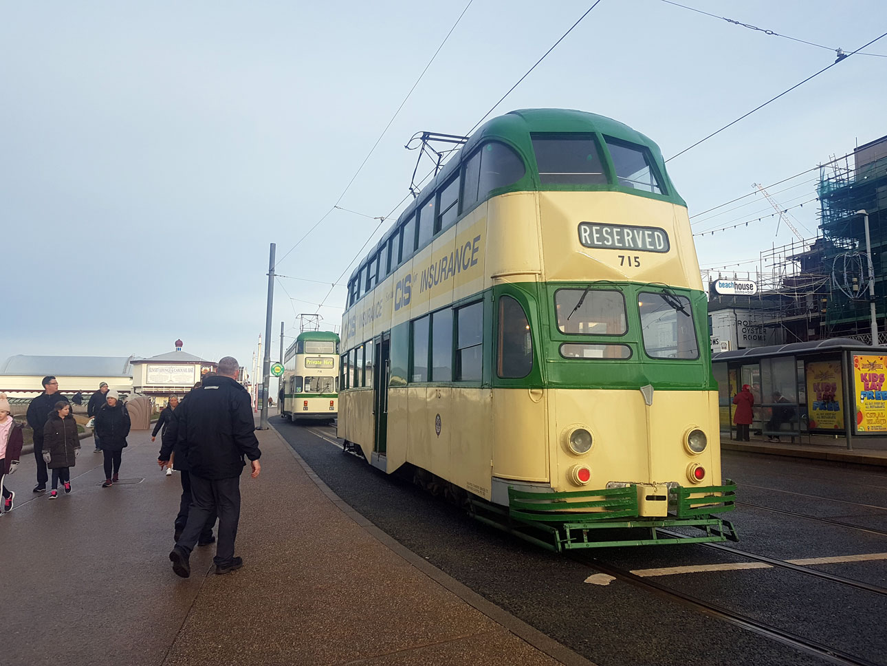 715 and 718 get ready for the off from Tower and North Pier heritage stop catching some passing glances from a family out for a Christmas holiday walk.