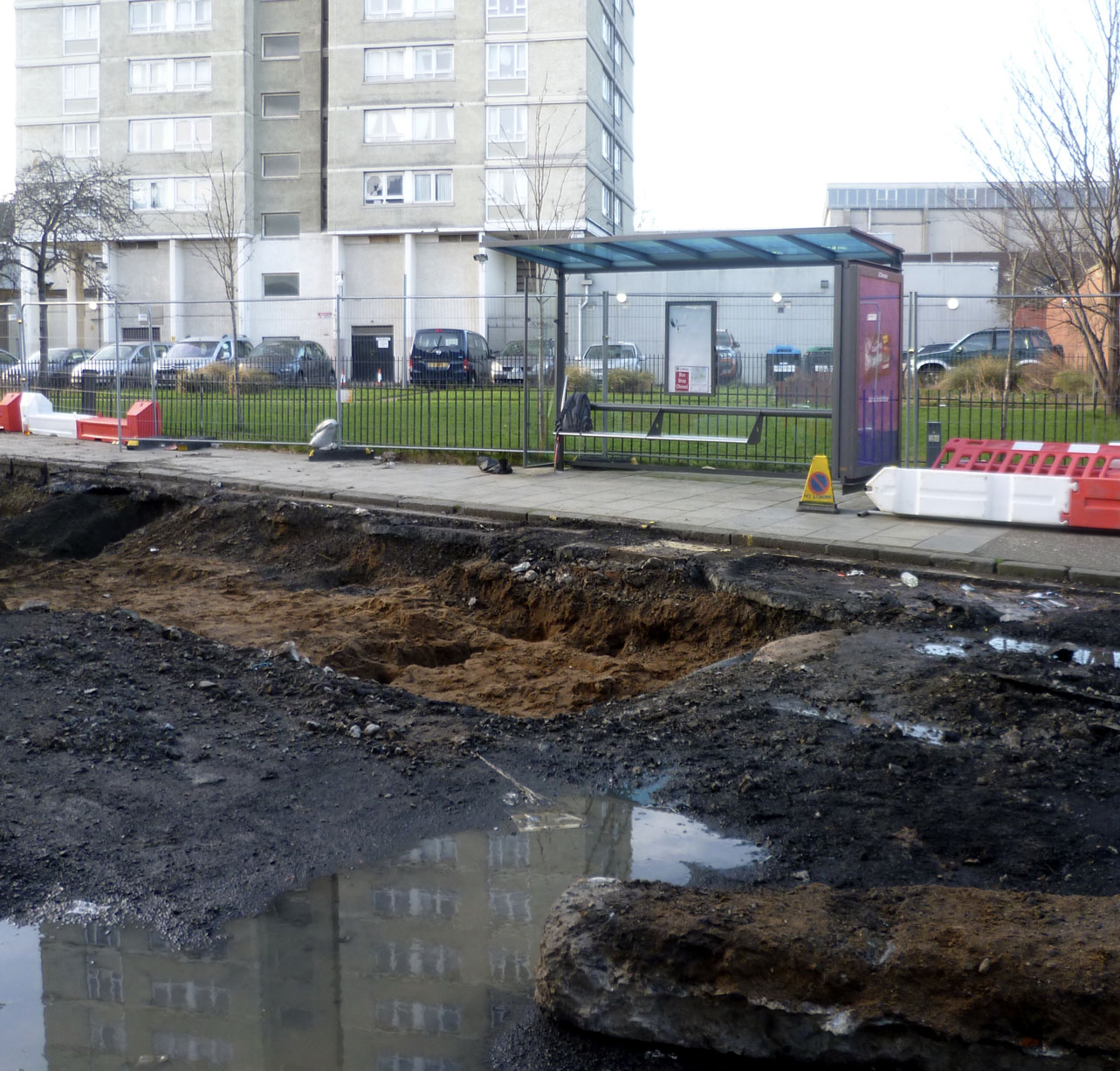 There won’t be any buses here for some time! This Laurie Strete bus stop on Constitution Street was served by the no. 16 to between Newhaven and Silverknowes and Kirkgate House tower block is behind.